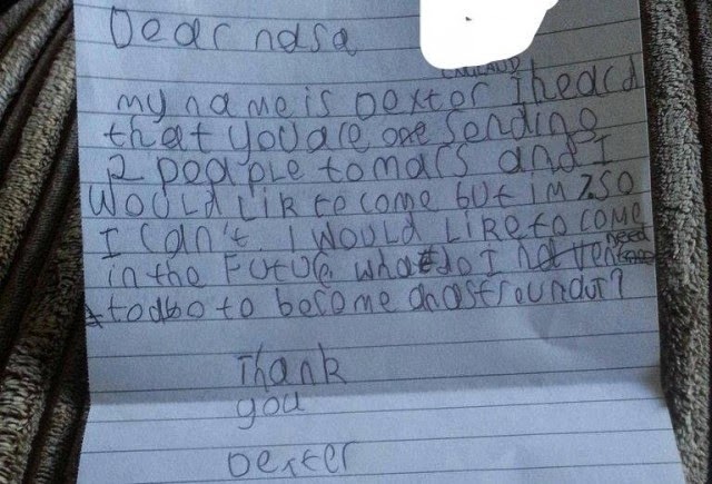 ***A personal note – A child of seven, Dexter, sent the below letter stating that he heard they were looking for two people to go to Mars and he would love to in the future as right now he is only seven. NASA responded with a letter of the keep the dream alive variety and some Mars swag. Alright NASA, and Dexter, good going, seeing you on the front page and in my telescope in a couple of decades!